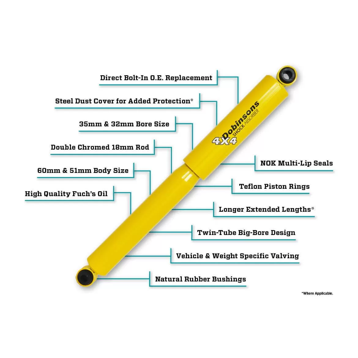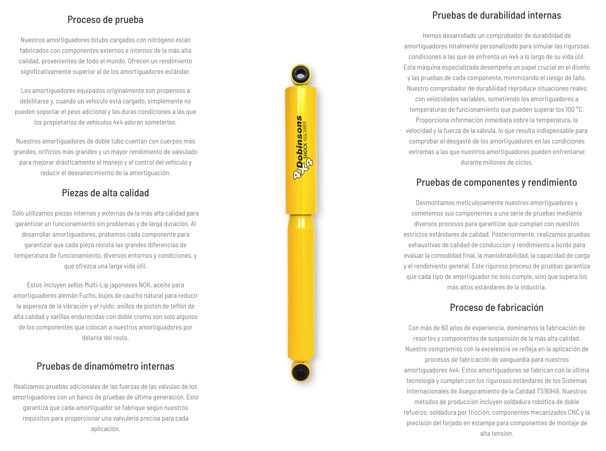 Los amortiguadores Bitubo de Dobinsons están diseñados para usuarios de 4×4 que buscan una suspensión confiable, económica y resistente, capaz de afrontar terrenos exigentes y cargas variables sin perder estabilidad. Ofrecen una gran mejora sobre los amortiguadores OEM estándar, combinando confort y control, con una fiabilidad probada en laboratorios y pruebas reales .